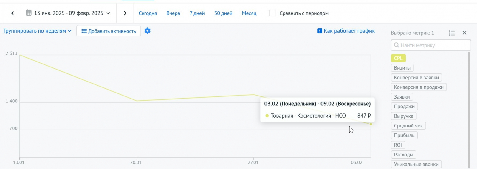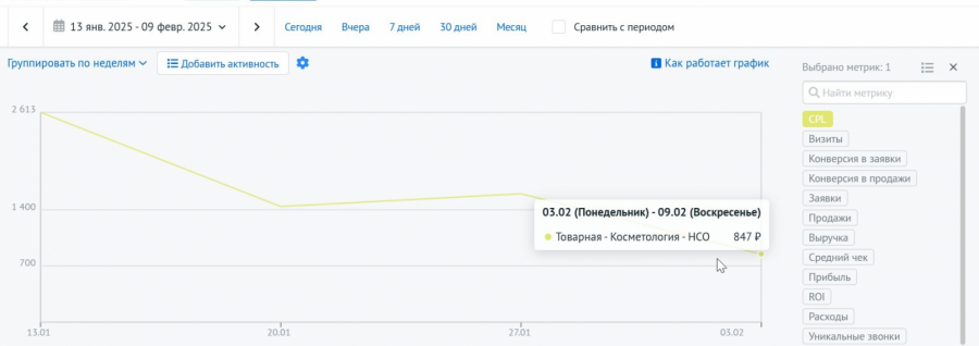 В первую неделю после запуска стоимость лида составила 2 613 руб. В первую неделю февраля она снизилась до 847 руб.
