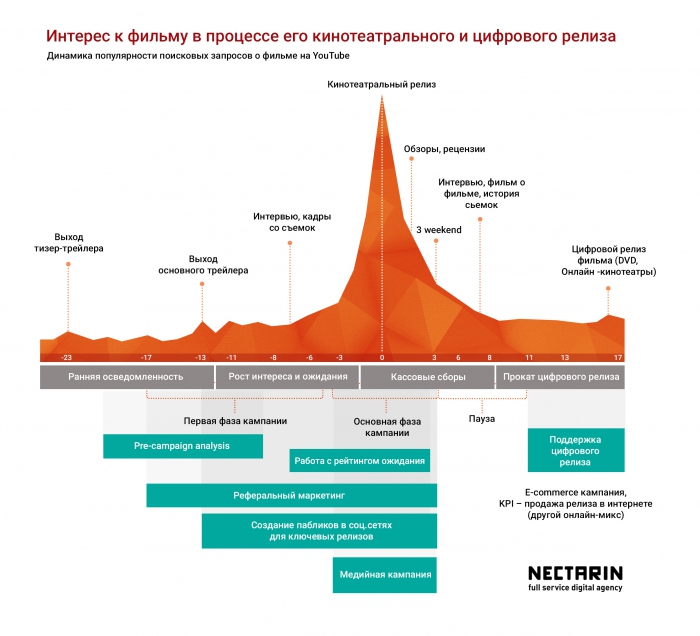 Медиа-давление в идеальной рекламной кампании кинотеатрального релиза в digital должна зависеть от роста естественного интереса к нему по мере приближения выхода в прокат. На каждом этапе используются свои инструменты, работающие лучше всего именно в этот временной период.