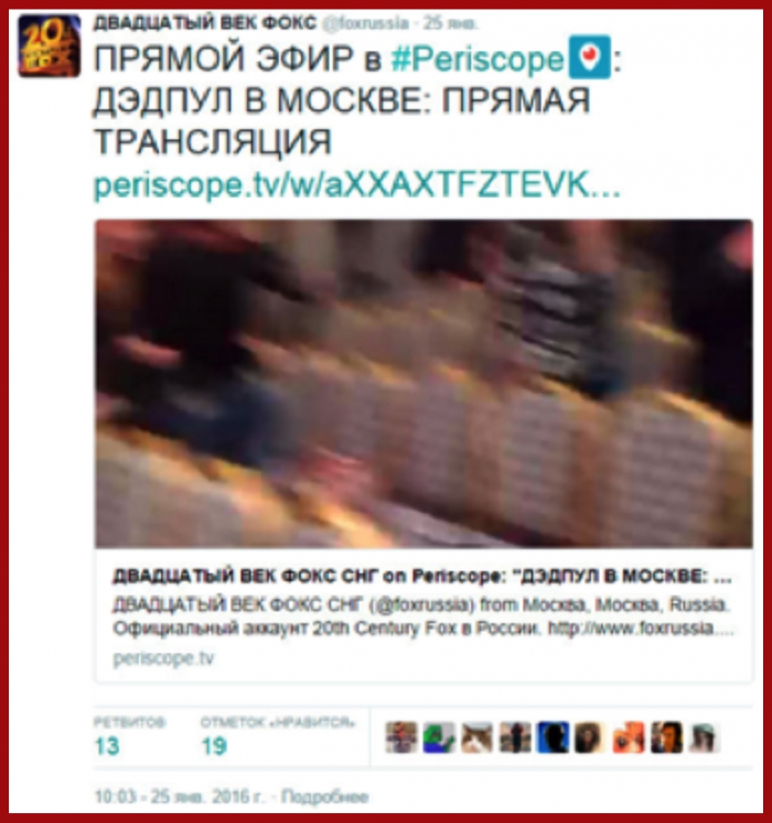 Мы первые, кто опробовал данный инструмент в действии на локальном уровне, по инициативе Александра Коваленко, который курирует все вопросы, связанные с digital и новыми медиа в российском офисе "Двадцатого Века Фокс". Создание канала и его раскрутка начались за четыре дня до трансляции с анонсирующих постов в сообществах Фокс, партнеры проекта в соц.сети на бесплатной основе провели кросс-постинг.