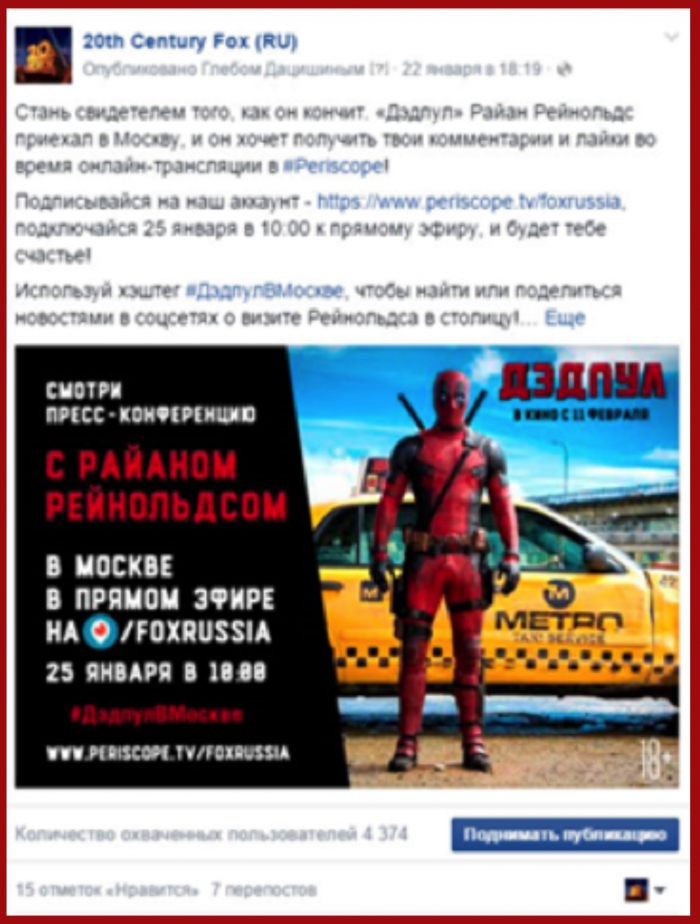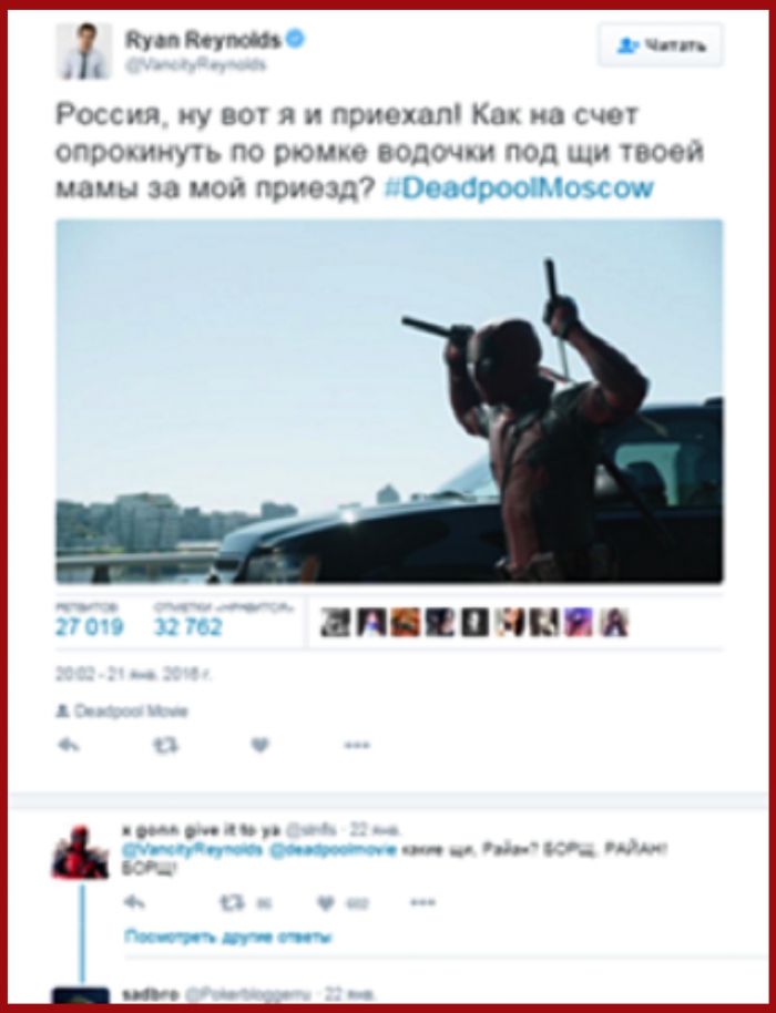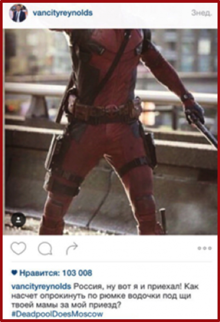 Для продвижения профайла Райана Рейнольдса (актер, сыгравший главного героя картины - примеч.редактора) по приезде в Москву, нашей задачей было привлечение внимания фанатов Дэдпул и завоевание лояльности среди российской аудитории. Мы написали несколько постов для Рейнольдса в Instagram и Twitter-аккаунтах на русском языке.