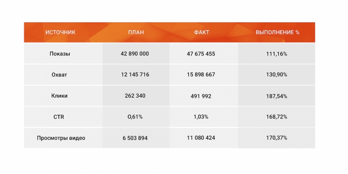 Если говорить об итоговых результатах рекламной кампании, то они демонстрируют высокий интерес интернет-аудитории к креативам кампании и к новым отечественным релизам. Ежедневный мониторинг рекламной кампании позволил перевыполнить прогнозируемые показатели по количеству переходов на сайт. Помимо этого, наибольшего перевыполнения удалось достигнуть в показателе охвата и количестве просмотров видео.