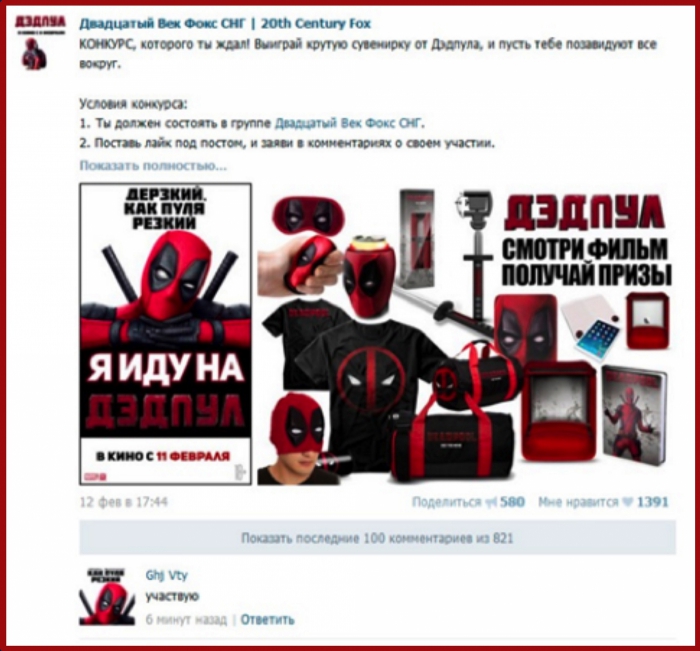 В рамках кампании мы, по инициативе компании "Двадцатый Век Фокс", провели несколько конкурсов в социальной сети VK.com. Для того, чтобы принять участие в конкурсе в сообществе “Фокс Россия” пользователи должны были изменить свой Профайл, поставив предложенный нами аватар с изображением героя и подписью “я иду на Дэдпул” и оставить комментарий, что они участвуют. Результаты были поразительны: 833 пользователей оставили комментарии, 800 из них сменили аватарку. Охват конкурса составил более 500 000.