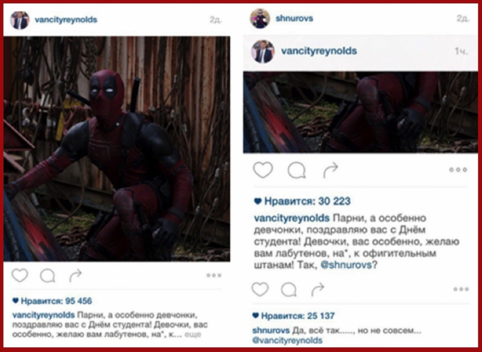 В рекламе фильма нужно уметь быстро принимать решение. Так у нас с клиентом появилась идея о написании еще одного поста для Instagram Райана с упоминанием всероссийского дня студентов, широко отмечаемого 25 января (Дата пресс-конференции Рейнольдса в России). В посте актер кино-картины поздравил учащихся и процитировал популярную песню российской группы “Ленинград”, которая в то время произвела фурор, как следствие - шумиху, в Интернет-среде, и отметил её фронтмена в тексте поста. Солист группы “Ленинград” Сергей Шнуров отреагировал на пост буквально спустя час.