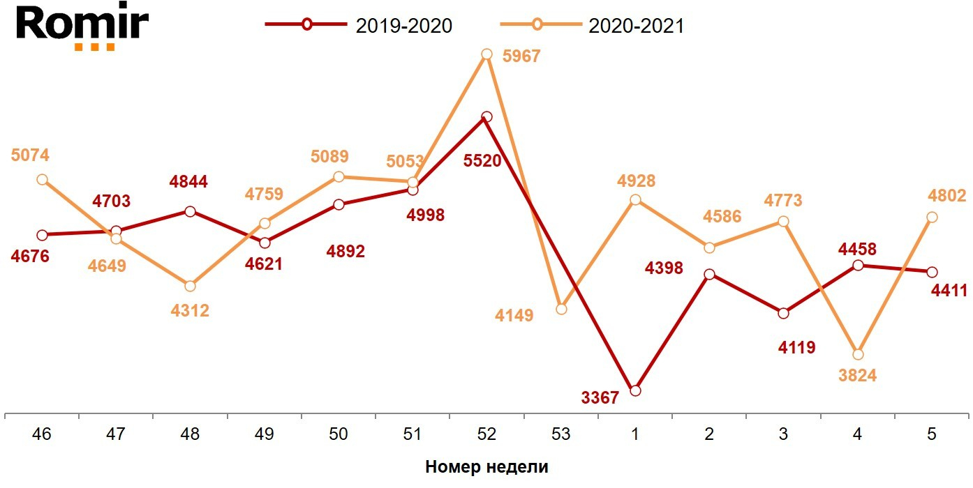 Если сопоставить текущее значение недельных расходов с аналогичным периодом 2020 года, то в прошлом году они были на 391 рубль (8,9%) меньше. Средняя стоимость одной покупки при этом выросла до уровня 599 рублей. Это на 18 рублей (3,1%) больше показателя предыдущей недели, и на 66 рублей (12,4%) больше размера недельного чека 5-й недели 2020 года.