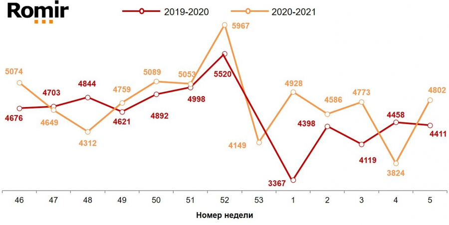 В первую неделю февраля 2021 года недельные расходы россиян выросли до 4802 рублей, что на 978 рублей (25,6%) больше суммы, которую тратил среднестатистический житель России в период с 25 по 31 января 2021 года. Данные приводятся в исследовании холдинга «Ромир».