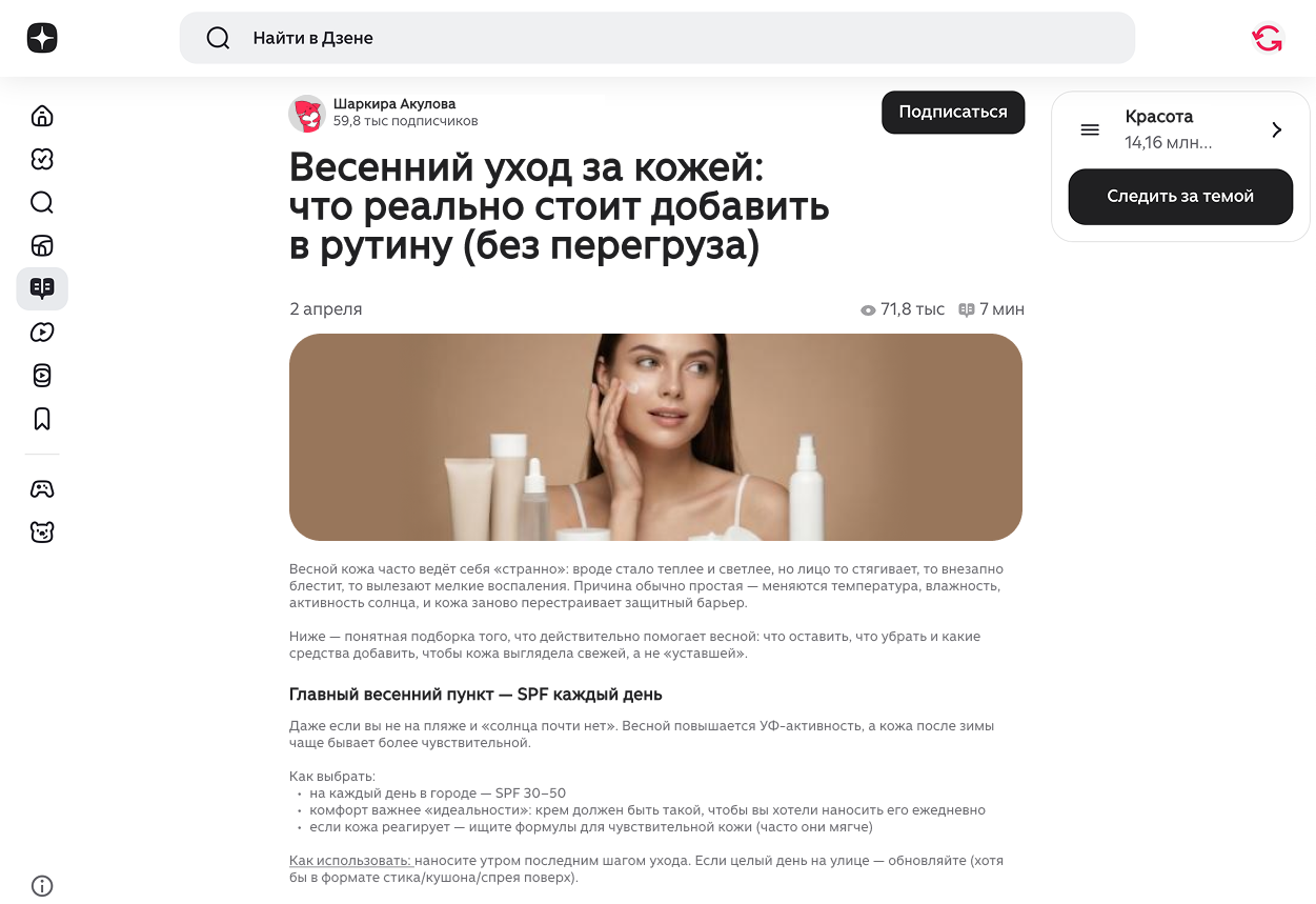 Ключевая особенность площадки — форматы. Здесь лучше всего работают развернутые тексты с визуальным сопровождением: статьи, разборы, личные истории, гайды и подборки. Контент строится как последовательный нарратив — с заголовком, подводкой, развитием мысли и выводом, дополненный изображениями или короткими видео.