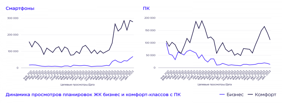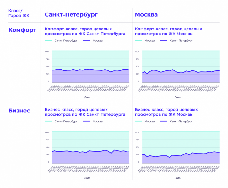 Москвичи активно смотрят объекты недвижимости, расположенные в Санкт-Петербурге. 40% конверсий по ЖК комфорт-класса в северной столице совершают жители Москвы, по бизнес-классу почти такой же показатель. Связано это с тем, что недвижимость в Санкт-Петербурге дешевле, чем в Москве. Кроме того, петербургские застройщики при настройке рекламы расширяют геотаргетинг на столицу, потому что видят у петербуржцев снижение покупательной способности.