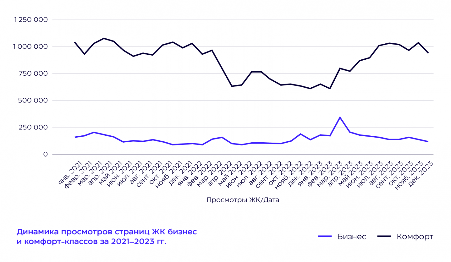 Внешние факторы воздействуют сильнее на интерес к недвижимости комфорт-класса, чем бизнес-класса. К примеру, начало спецоперации привело к резкому спаду интереса к ЖК комфорт-класса, при этом жилые комплексы бизнес-класса показали небольшой рост. В мае 2022 года спрос на «комфорт» начал расти из-за постепенного снижения ключевой ставки, интерес к бизнес-классу остался на том же уровне.