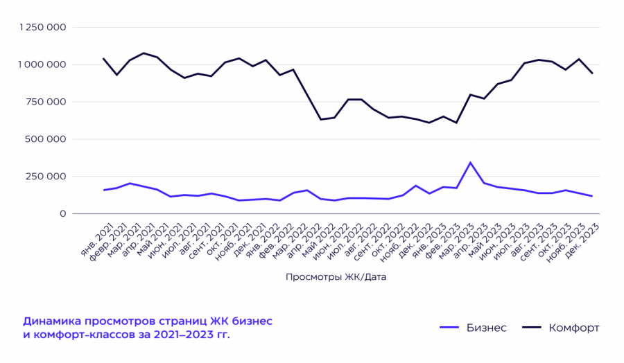 Агентство проанализировало интерес пользователей и конверсии по 77 проектам жилых комплексов (ЖК) комфорт- и бизнес-класса. За интерес взяли просмотр страницы конкретного ЖК, а за конверсию — просмотр планировки комплекса на сайте застройщика.