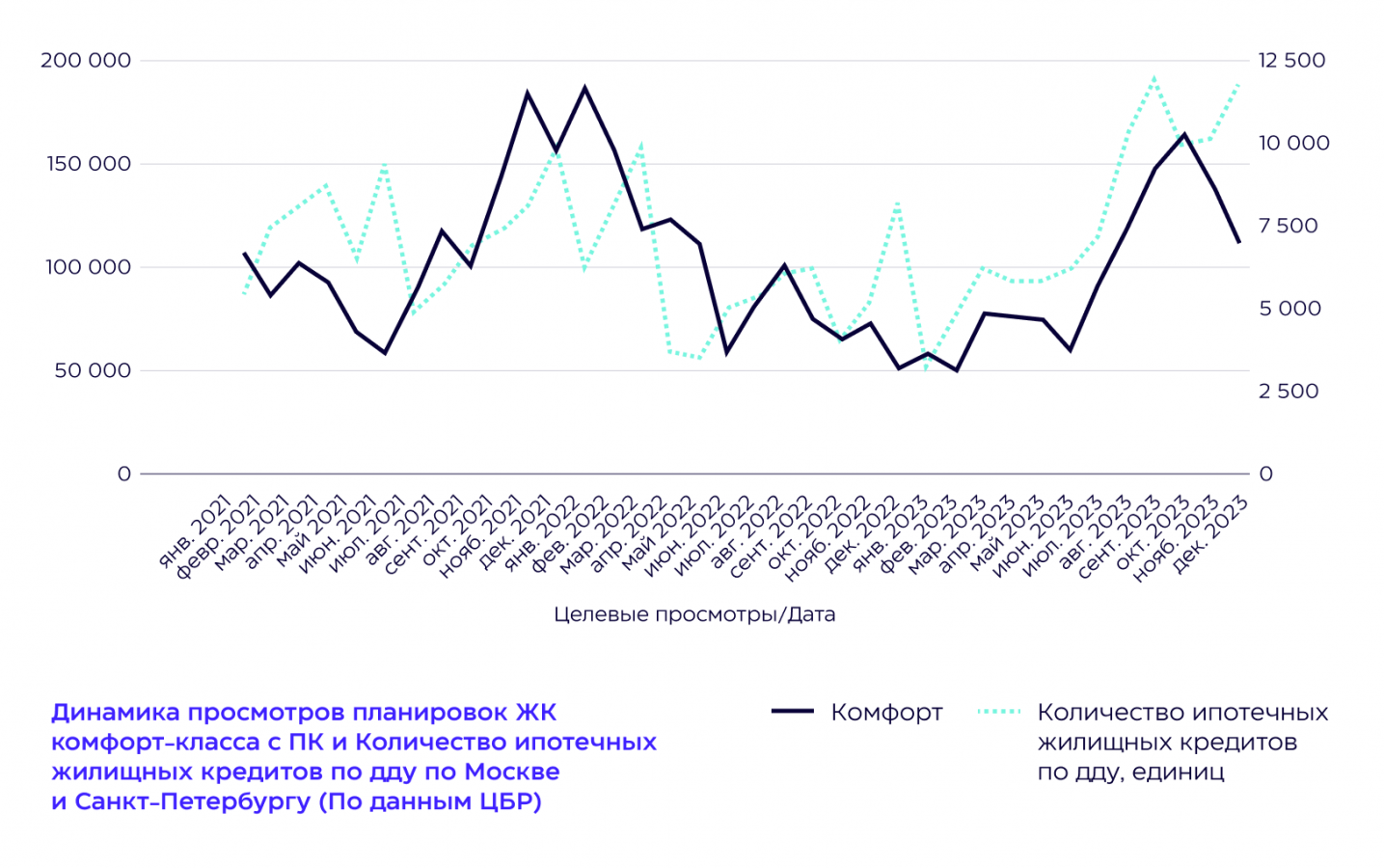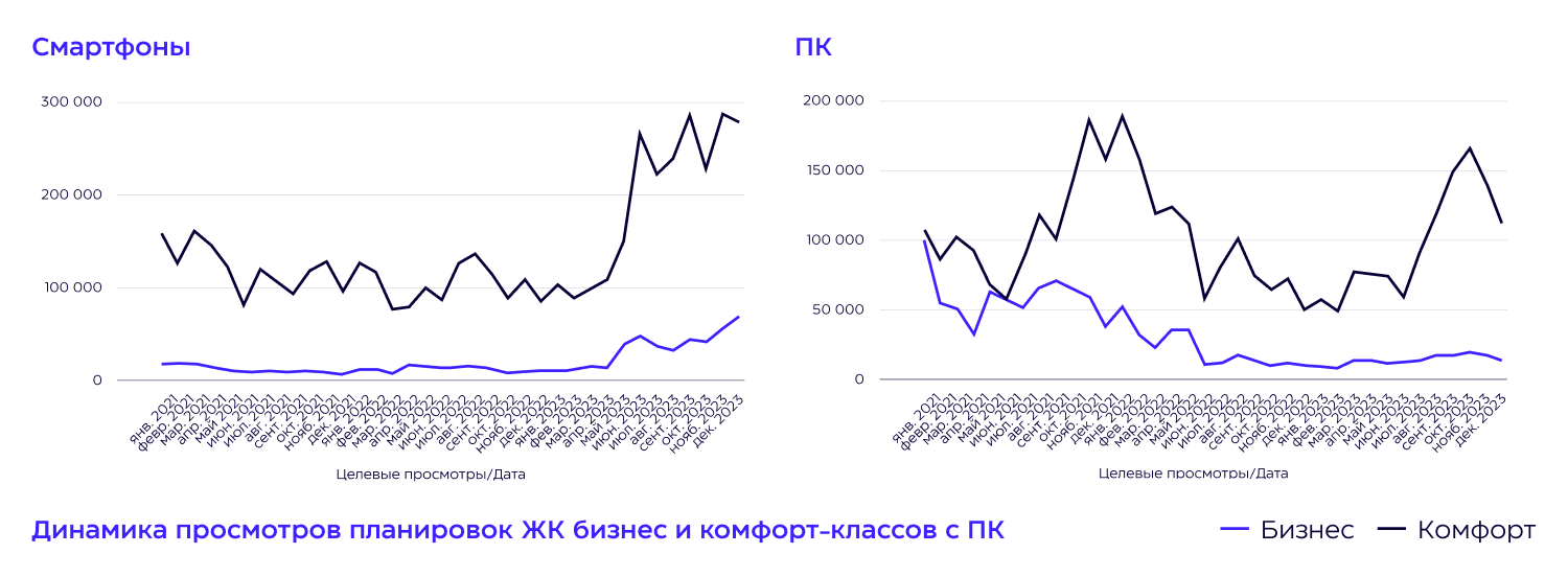 Спрос у россиян, использующих ПК, на недвижимость зависит от динамики выдачи ипотек. Так, всплеск выдачи кредитов в декабре 2021 года на графике повторяет всплеск конверсий в ноябре того же года, а сентябрьский пик выдачи кредитов в 2022 году, когда произошло снижение ключевой ставки Центробанком РФ до 8%, последовал после пика спроса в августе.