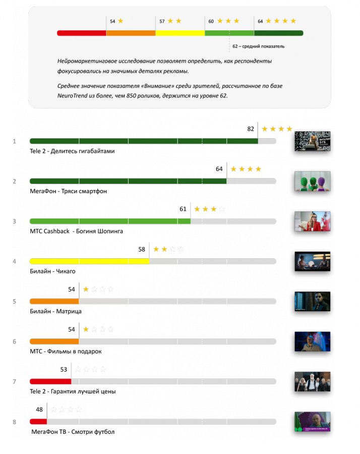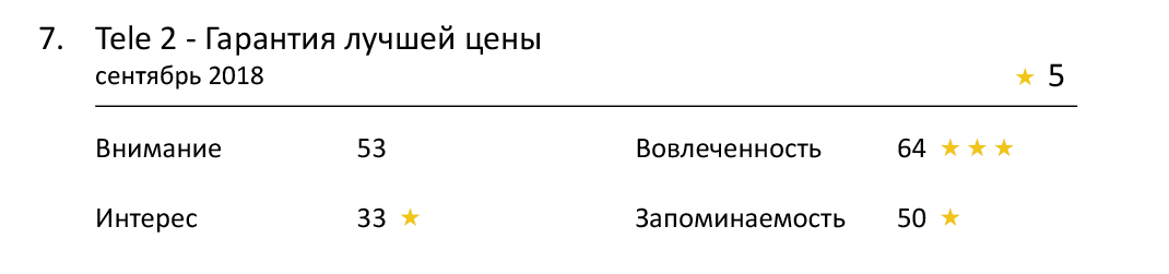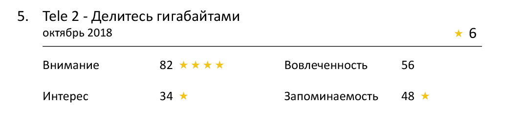 В лидеры по способности привлечь внимание зрителей с большим отрывом и отличным результатом выбилась реклама «Делитесь гигабайтами» от оператора «Теле 2». Ролик получил 82 балла, максимальные 4 звезды.