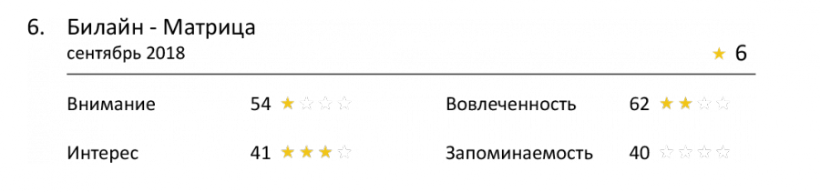 Чуть менее интересным показался зрителям сюжет ролика «Билайн» — «Матрица». Он получил 3 звезды и 41 балл по данному показателю.