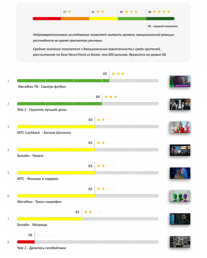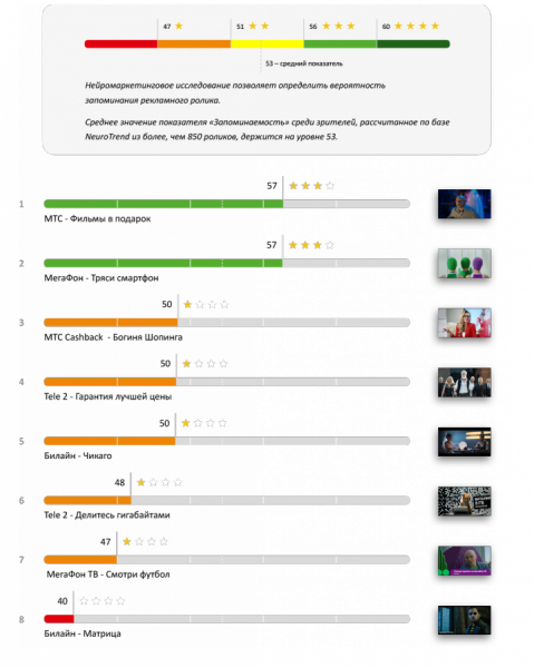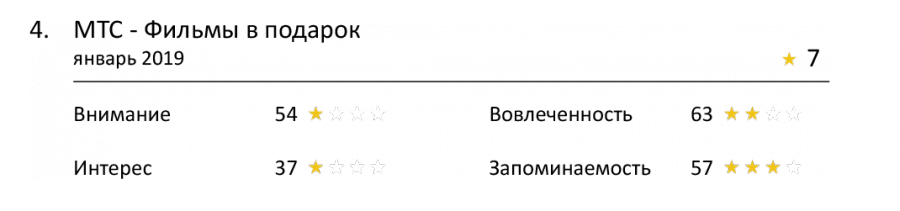 На вершине рейтинга, хоть и с тремя звездами, оказались МТС — «Фильмы в подарок» и «Мегафон» — «Тряси смартфон». Ролики неплохо запомнилась зрителям и получили по 57 баллов.
