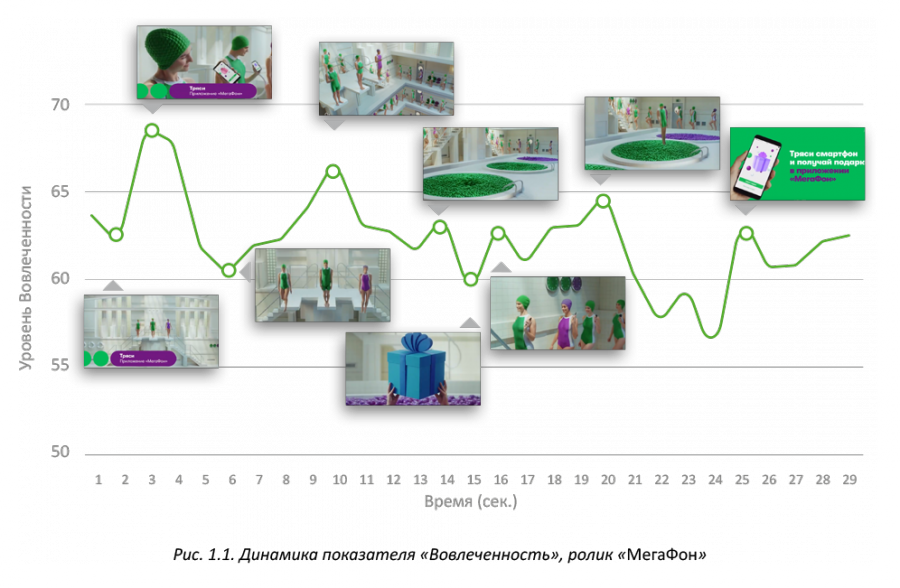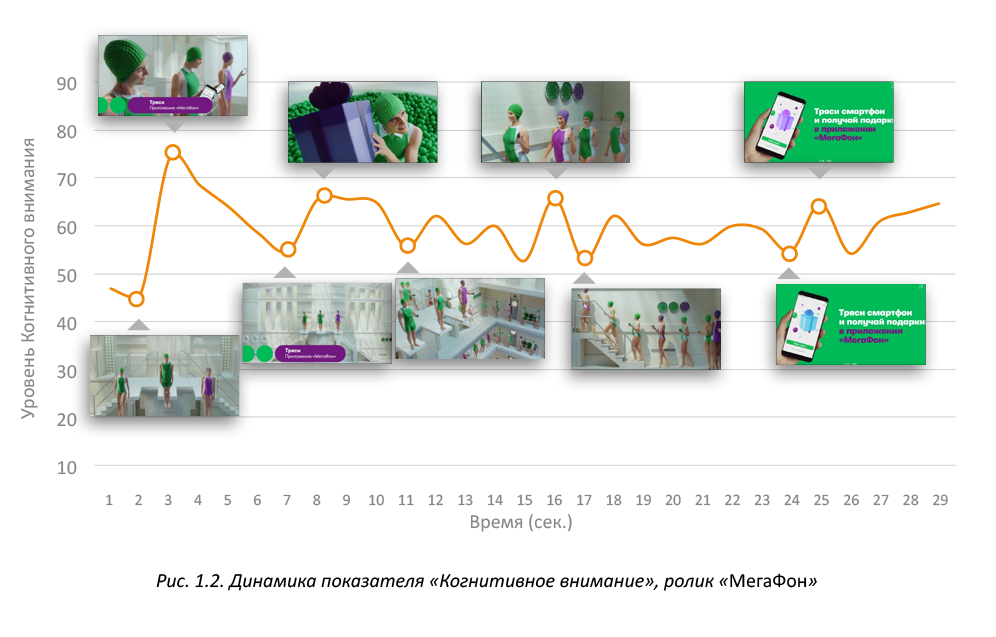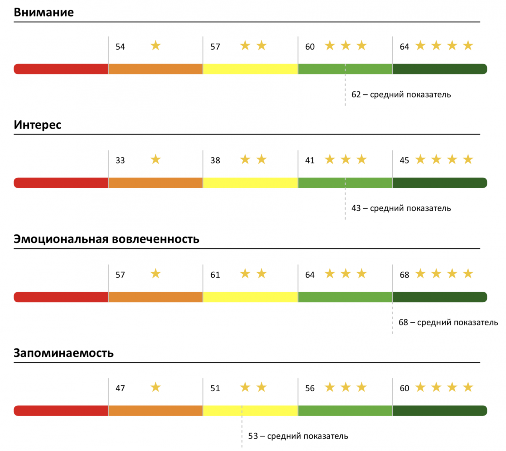 В каждом исследовании участвуют не менее 30 респондентов. В результате рекламу оценивают по четырем основным нейромаркетинговым показателям: внимание, интерес, эмоциональная вовлеченность и запоминаемость.