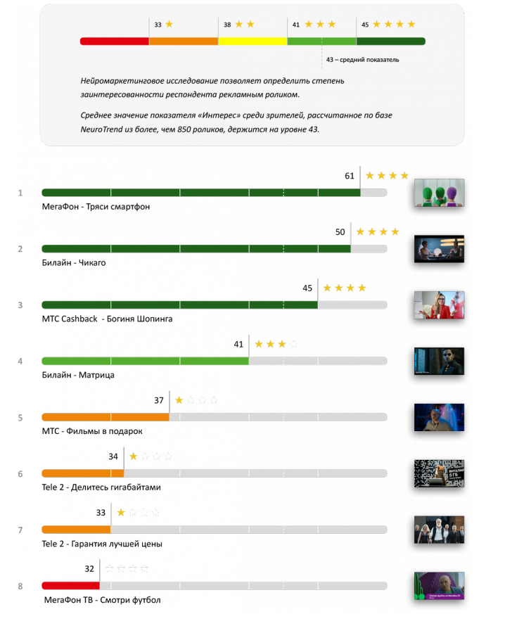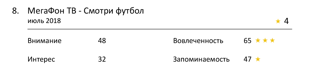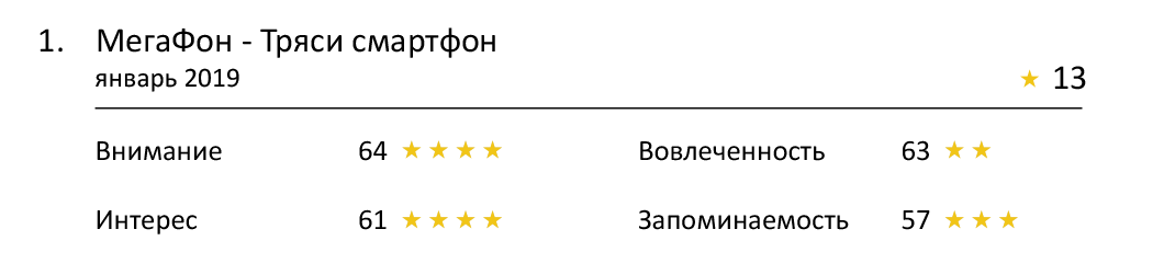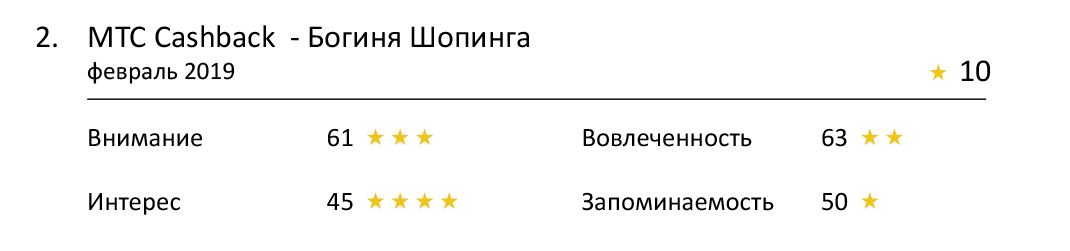 Вызвать интерес у зрителя — непростая задача. Лучше всех справиться с ней удалось трем рекламным роликам: «Мегафон» — «Тряси смартфон» (61 балл), «Билайн» — «Чикаго» (50 баллов) и МТС Cashback — «Богиня Шопинга (45 баллов). Эта реклама получила 4 звезды и заняла три первые позиции ТОПа.