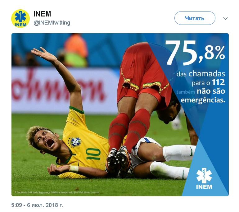 Нападающий сборной Бразилии Неймар, лежащий на футбольном поле, попал на плакат португальской службы экстренной помощи (INEM), показывающий статистику ложных вызовов «неотложки». Изображение опубликовано в официальном Twitter-аккаунте ведомства.