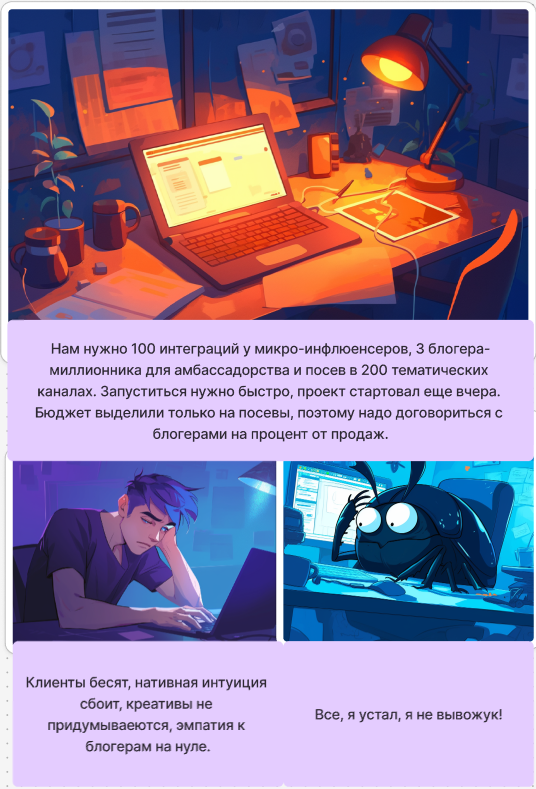 Чтобы ускорить работу, мы запараллелили несколько процессов. Сценарист делал раскадровку с текстом и генерил визуалы. Редактор читал тексты и вносил корректировки.