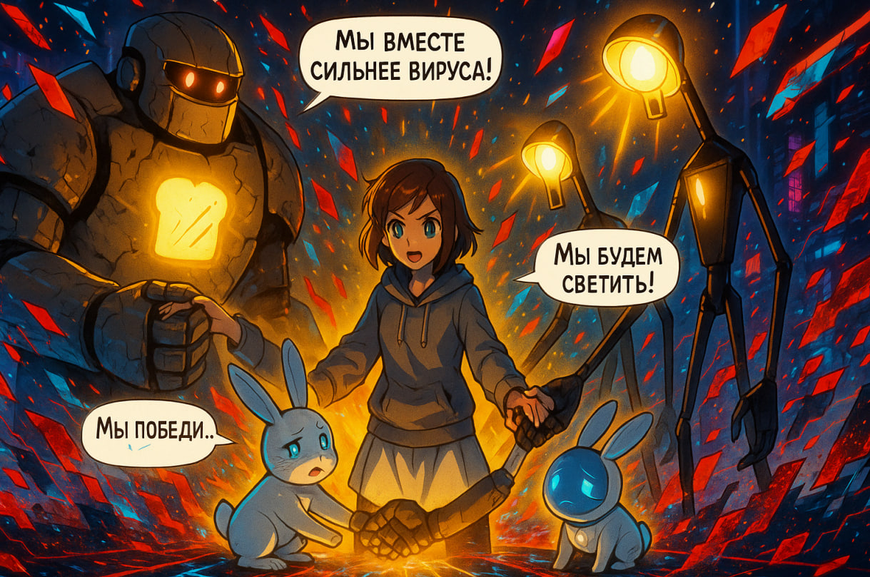 Beetl переносит эту идею в неоновые руины будущего, где вирус захватывает целую вселенную, внушая машинам, что они устарели и больше не нужны. Алиса — девушка, случайно (или вовсе не случайно) оказавшаяся в центре этой битвы, и ее спутник Робо-заяц встречают неожиданных союзников. Сквозь глитчи и иллюзии они ищут ответ на главный вопрос: как сохранить себя, когда миром правят алгоритмы. И, может быть, открывают простую истину: важно не совершенство, а то, что ты нужен.