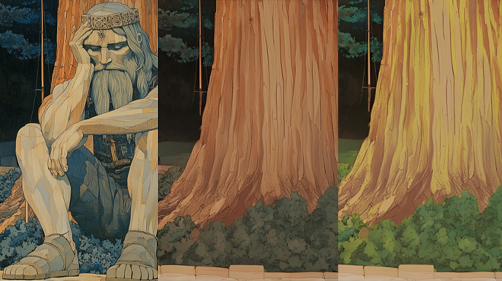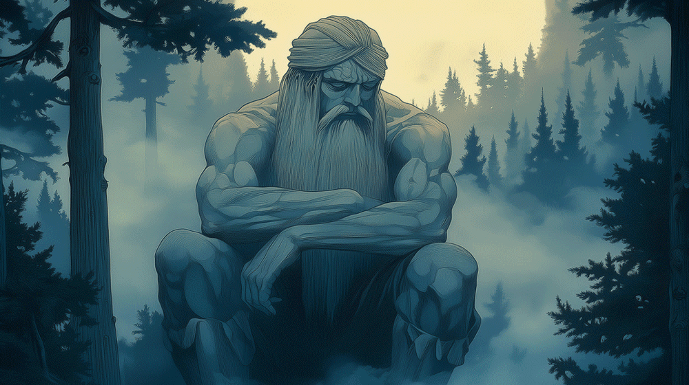 Landscape showing a huge wooden statue of a giant with beard sitting next to a large tree, river nearby, late evening, illustration, Ivan Bilibin style --stylize 400 --ar 16:9 --v 6.1