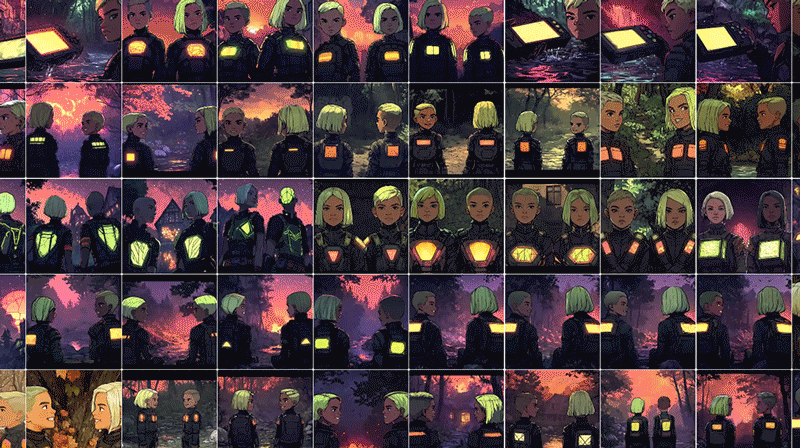 Поэтому нам потребовалось более 200 генераций для каждого из 8 персонажей, чтобы отточить образы и сделать их лица идеальными для параметра -cref (character reference) — функции в Midjourney, которая прикрепляет референс персонажа к генерируемой сцене. Цвет и повторяющиеся элементы одежды играют важную роль в запоминании образа, поэтому мы уделили им не меньше внимания, чем таким деталям, как прическа и возраст.