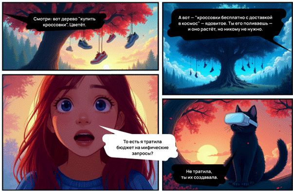 Сейчас — время прозрения, когда мы перестаем верить в красивые отчеты без смысла, в охваты вместо результатов, в активность вместо продаж. Когда наконец смотрим на данные не как на показатели для презентации, а как на сигналы из реальности. Нейрокомикс транслирует основную идею: даже один вопрос, заданный вслух, может запустить цепную реакцию изменений.