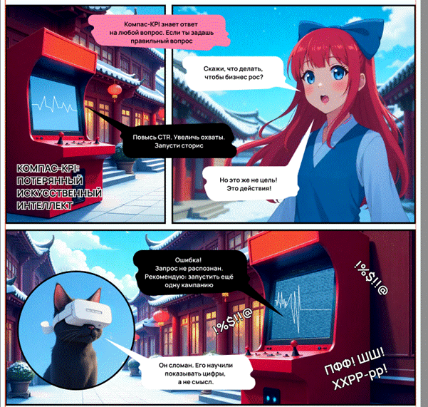 Еще острее проблема всплыла у кадра с Компасом-KPI — старым автоматом, который должен был говорить только цифры, но вместо этого выдавал пустые клише: «повысь CTR», «запусти сторис», «увеличь охваты».