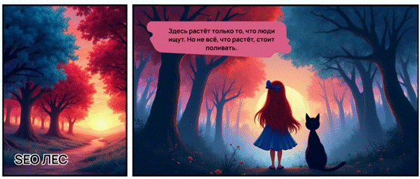 И прежде чем Алиса успела спросить: «Это сон?», — она уже падала сквозь SEO-лес, где деревья кричали запросами, через площадь платного трафика, где баннеры буквально хватали за рукав, мимо компаса-KPI, который знал все, но отвечал только на вопросы, которых никто не задавал…