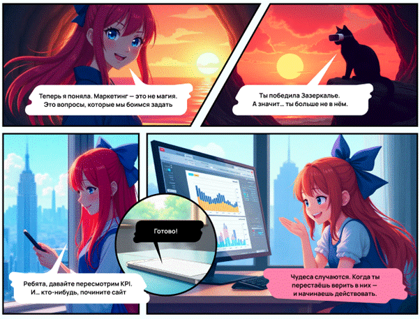 Каждая локация Зазеркалья — это реальная боль: SEO-лес — когда оптимизируешь контент под запросы, которые никто не ищет. UX-мост — сайт, который красиво выглядит, но не работает. CRM-катакомбы — база лидов, по которой никто не звонит. Главной задачей было посмотреть на маркетинг со стороны. Поэтому мы добавляли узнаваемые фразы: «Запустим еще одну кампанию», «Сделаем красиво — конверсия придет сама», «Он в CRM — значит, активный». Финал был ключевым: вместо «и жили они долго и счастливо» — «она задала вопрос». Потому что вопрос — это и есть начало перемен.