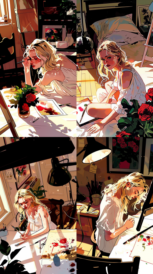Top-down view of a cozy girl's bedroom with warm yellow lighting. A blonde girl is painting a canvas with watercolors. The room has paints, brushes, and easels, creating a creative atmosphere. The style is hand-drawn and realistic comics --sref --cref