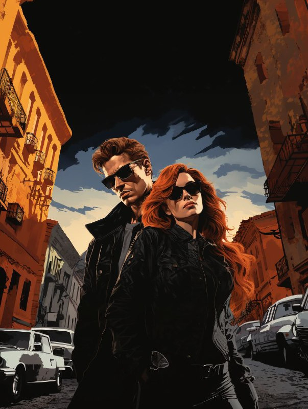 epic shot from ground level of a red-haired man and a woman in black glasses and black leather jackets, comics made by Brian Bolland, in the style of manga-inspired dynamic graphic novel --ar 3:4 --s 200 --v 5.2 --style raw