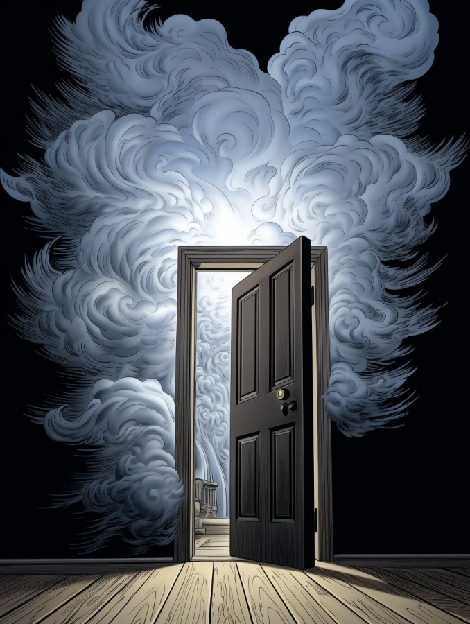 Иногда MJ отходит от поставленной задачи, создавая чем-то схожую картинку, но добавляя/изменяя отдельные элементы. К примеру, здесь мы хотели получить закрытую дверь, из-под которой идет дым. А MidJourney сгенерила сюрреалистичную картину с открытой дверью. Это решается пересборкой промта, когда мы меняем слова местами или подбираем синонимы.