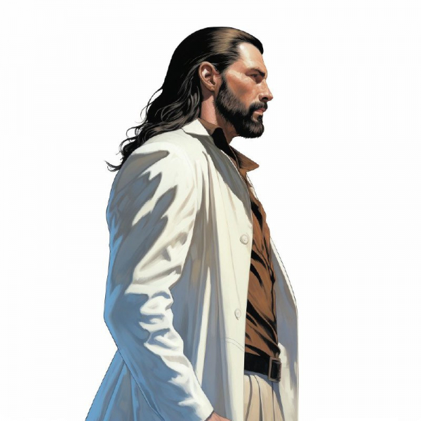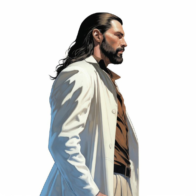 sideview of a man in white coat with long black hair and beard standing on white bg, comics made by Brian Bolland, in the style of manga-inspired dynamic graphic novel--ar 3:4