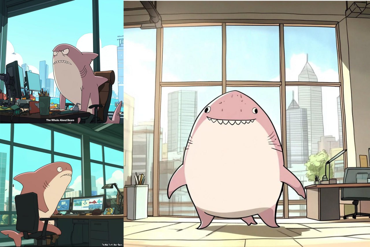 Авторы стали искать другие стили, более дружелюбные и менее антропоморфные. Выбирали из зарубежных мультфильмов, так как нейросеть их знает лучше, чем отечественные. Были такие идеи: «Время приключений», «Вся правда о медведях», Хаяо Миядзаки и «Дисней». Команда попробовала сгенерировать разные варианты и выбрали «Вся правда о медведях». Акула отлично вписалась в их стилистику. Она оказалась наиболее удачной за счет округлых и милых персонажей-животных.