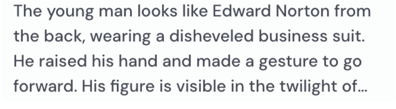 Лицам персонажей пытались придать детальное описание, а также пробовали ссылаться на известных личностей. Например, изначально главный герой должен был быть похож на Эдварда Нортона, но нейросеть выдавала странные варианты:
