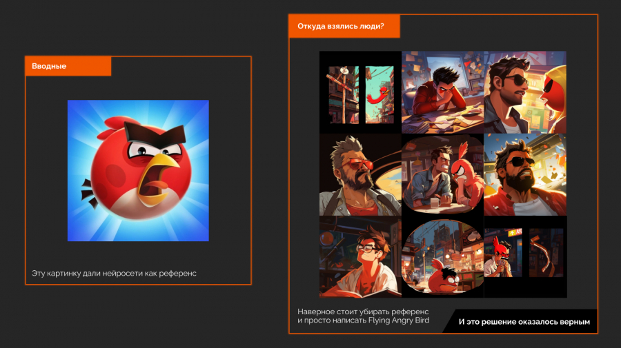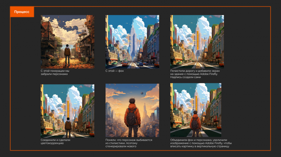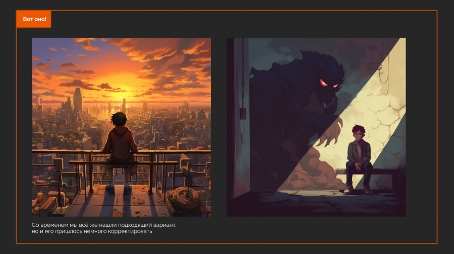 Дизайнеры вносили только косметические правки, но не исправляли суть сгенерированного изображения. Иногда нужно было убрать лишние детали, подогнать цвет под общую гамму или объединить две картинки. Например, мы делали цветокор и следили за цветом куртки главного героя.