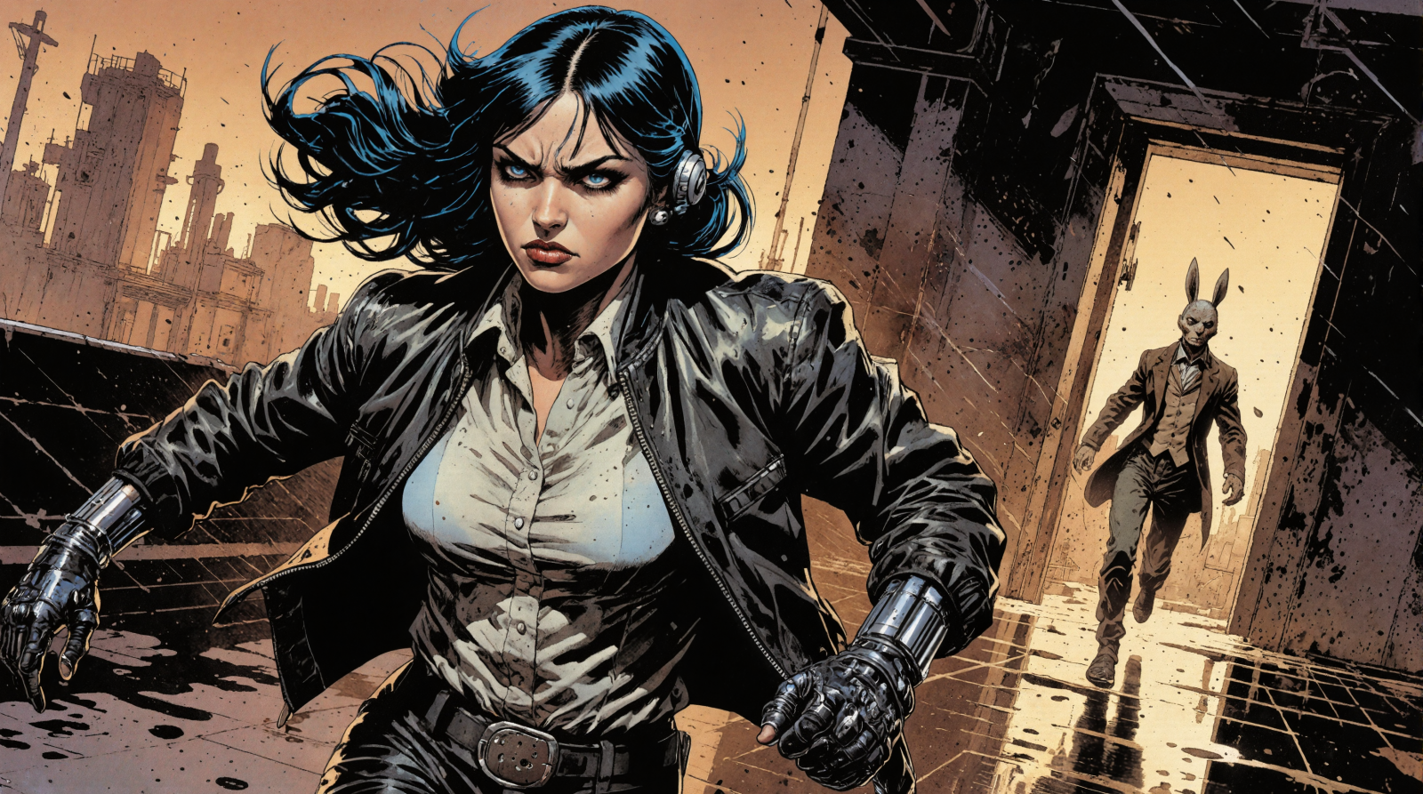 18−20 years old, slim athletic build, sharp and intelligent features, pale skin, very long jet-black hair tied in a high, messy ponytail with a single blue streak (like the original Alice's headband). Tired, melancholic but determined blue-grey eyes. A mix of functional space-wear and neo-Victorian elegance. Dark brown leather bomber jacket with a faded rabbit silhouette painted on the back, over a high-collared blue steampunk blouse. Black cargo pants tucked into heavy, magnetized engineer boots. A utility belt with brass cartridges and data-chips. On her right hand — a worn-out data-glove with glowing fingertips. On her left wrist — an antique pocket watch with a digital holographic display. Subtle cybernetic implants: a data-port behind her right ear, a micro-joystick implant on her left temple for ship control. 90s aesthetic, cinematic, dramatic lighting, film grain, detailed backgrounds, neo-Victorian cyberpunk, space western.