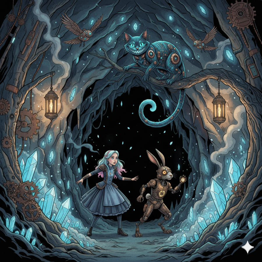 NadinKnyreva представила собственное прочтение классики — «Алису в Зазеркалье 2049». На этот раз история переносится в мир, где переплелись стимпанк и киберпанк, магия и технологии. Четырнадцатилетняя Алиса, попавшая по ту сторону зеркала, проходит тернистый путь бок о бок со всеми знакомыми персонажами, чтобы победить дракона и вернуться домой.