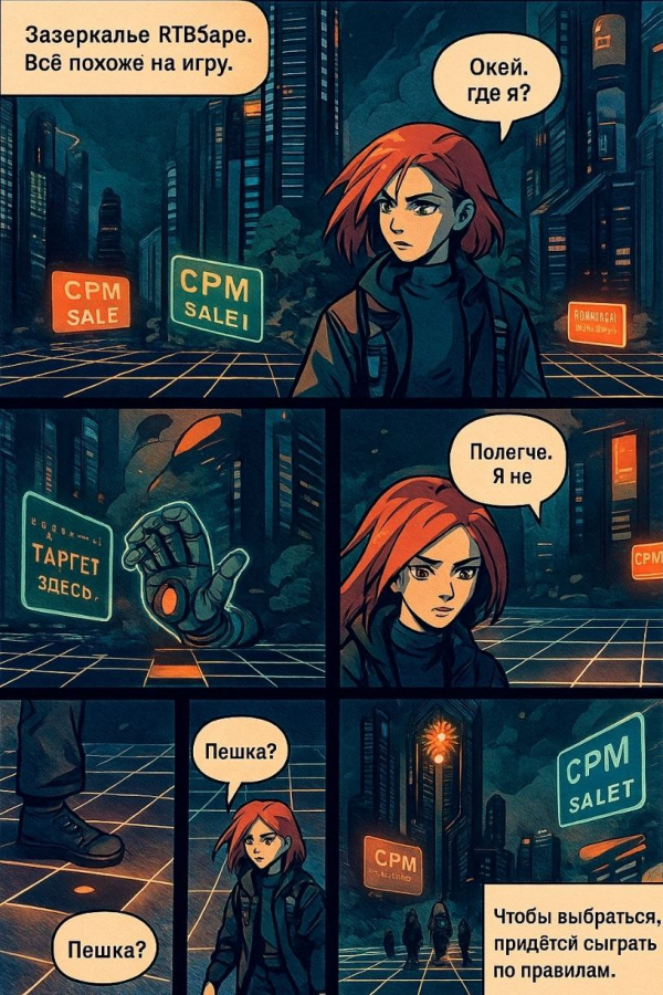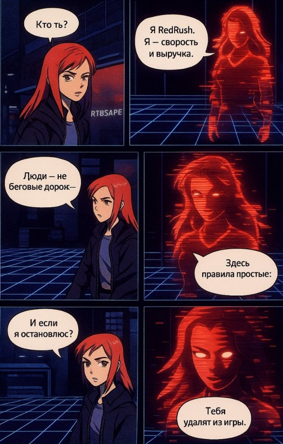 RTBSape переносит нас в 2049 год. Алиса, маркетолог нового поколения, на грани выгорания, встречает харизматичную Красную Королеву. Та предлагает ей простой выход — шагнуть сквозь зеркало в мир, свободный от дедлайнов и KPI, где весь груз забот возьмет на себя искусственный интеллект.