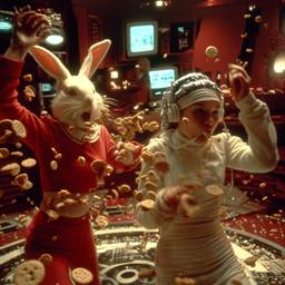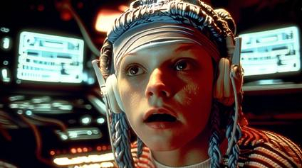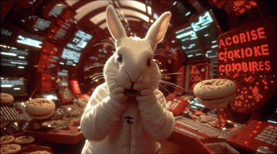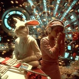 promt: A cinematic retro-futuristic sci-fi scene inspired by Alice in Wonderland, reimagined as a 1990s cyberpunk film. Visual style of Stanley Kubrick’s 2001: A Space Odyssey and Spielberg’s E.T. The setting is a dark, surreal apartment resembling Neo’s room from The Matrix, filled with CRT monitors, tangled wires, flickering green code, and strange, dreamlike lighting as if reality is bending. In the center, a young woman modern "Alice", around 20, European features, intense blue dreadlocks flowing like data streams, dressed in patched-up hacker clothes with glowing circuitry. She sits at a retro computer terminal, deeply focused on hacking reality itself. Beside her stands a humanoid rabbit a gritty, dystopian reimagining of the White Rabbit. He has a human-like body, dressed in a worn-out trench coat, his face rabbit-like but weary, eyes full of stories and sorrow, long ears drooping slightly, a metal pocket-watch embedded in his wrist. A 50-year-old soul in a strange body, veteran of many digital wars, part mentor, part broken rebel. Cybernetic implants glow faintly under his fur. He types on an old keyboard with quiet urgency. The apartment feels like a glitching dream warped shadows, floating code symbols in the air, cracks in the wall revealing digital void behind. The mood is haunting, surreal, nostalgic, like a dream you’re not sure you’ve woken from.