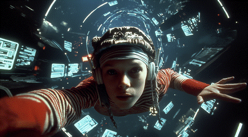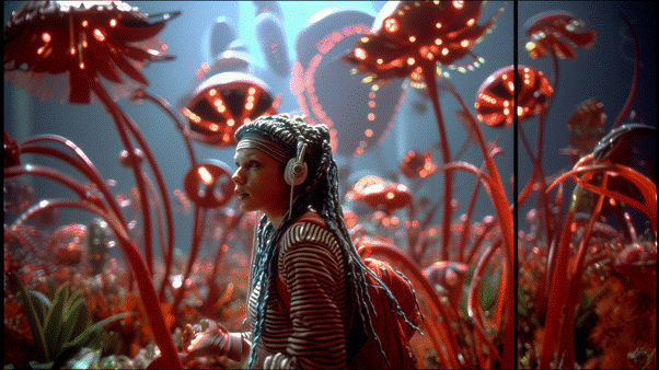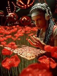 promt: A surreal, cinematic scene inspired by Alice in Wonderland, set in a dreamlike retro-futuristic cyberpunk world. Kubrick+Matrix style. A young woman around 20 years old, with flowing blue dreadlocks and glowing tech-woven clothing walks slowly through a vast open field filled with enormous biomechanical flowers. The flowers are towering and alien metallic tulips with neon stems, chrome sunflowers with turbine cores, and giant cybernetic roses that have been stripped of their petals, exposing glowing wireframes and glitching holographic memories of their former selves. Some flowers turn subtly as she passes, as if watching her not hostile, but sentient. Glowing sensors blink like eyes. Above her, the sky is soft vaporwave deep purples, synthetic pinks, electric blues layered with drifting holograms: fractured faces, flowing binary code, fragments of forgotten memories. The girl walks with quiet awe and melancholy, surrounded by this strange digital nature, a world on the edge of reality and simulation. Emotionally rich, soft cinematic lighting, wide-angle shot, dreamlike, poetic.