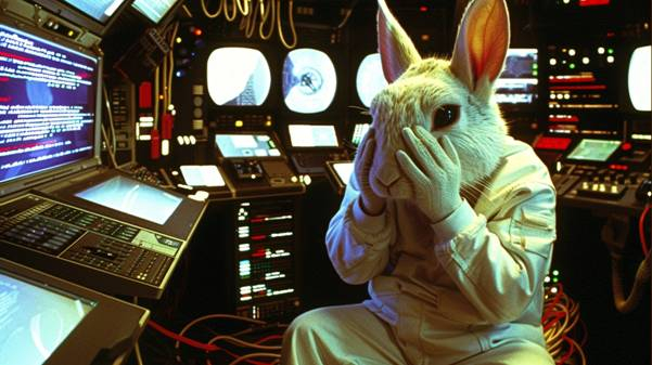 promt: tired humanoid white rabbit sitting in a small, cluttered hacker room, wearing a white worn-out work jumpsuit, slumped forward with hands covering its face in exhaustion, surrounded by old CRT monitors, glowing code on screens, loose cables, flickering neon lights, scattered keyboards, glowing cyberpunk tech, digital noise and glitch effects in the air, claustrophobic atmosphere, soft blue and green tones, detailed cyberpunk environment, cinematic lighting, emotional and melancholic mood.