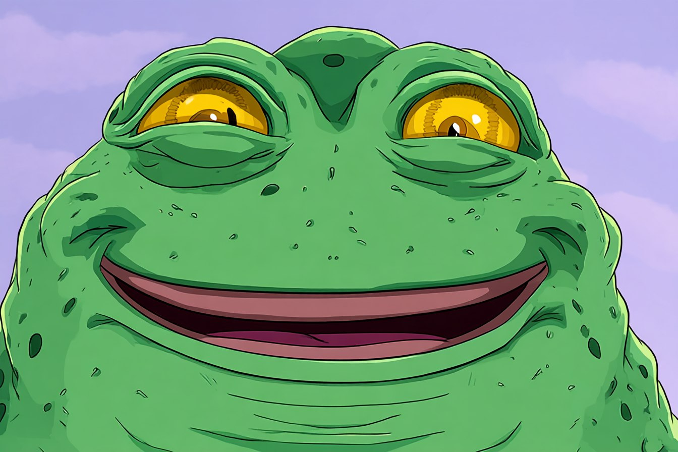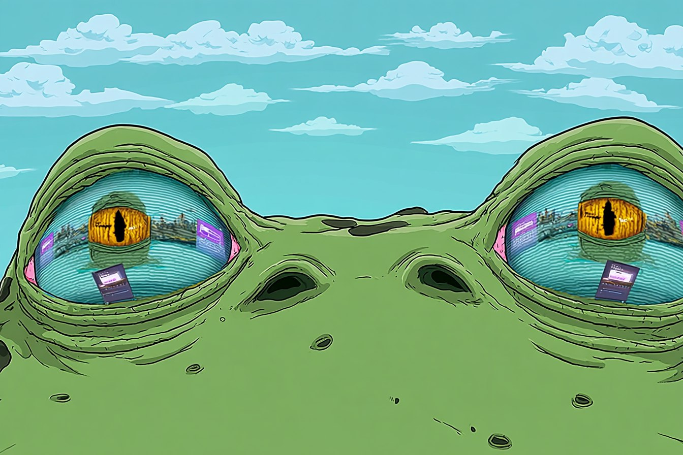 a green toad with two human eyes, each eye is the reflection of an adult man wearing a crown and having blond hair in a frontal view. in one lens, there's king arthur looking at the london skyline, while on the other lens, he sees the st. paul's cathedral building. cartoon style, in the style of rick & morty, with thick lines and vibrant colors --ar 3: