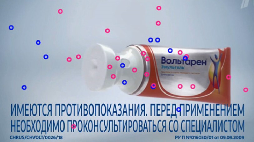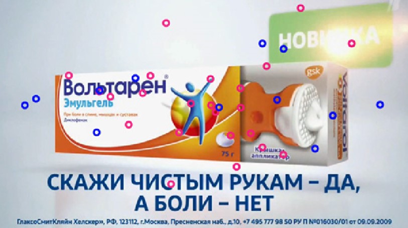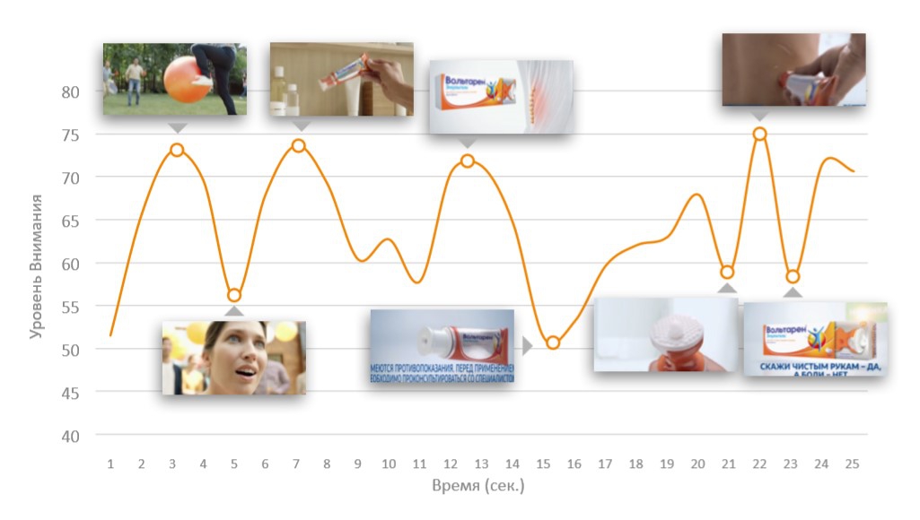 С 5 по 8 секунды уровень внимания сохраняется достаточно высоким, а взгляд прикован к тюбику. Промежуток с 13−15 секунды с точки зрения привлечения внимания не очень удачный — на экране пустота и только внизу надпись с противопоказаниями. Внимание падает.