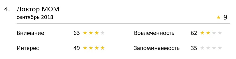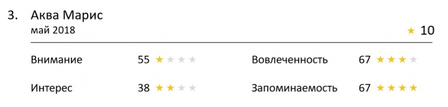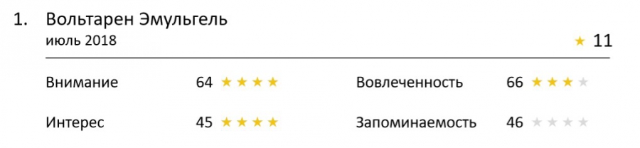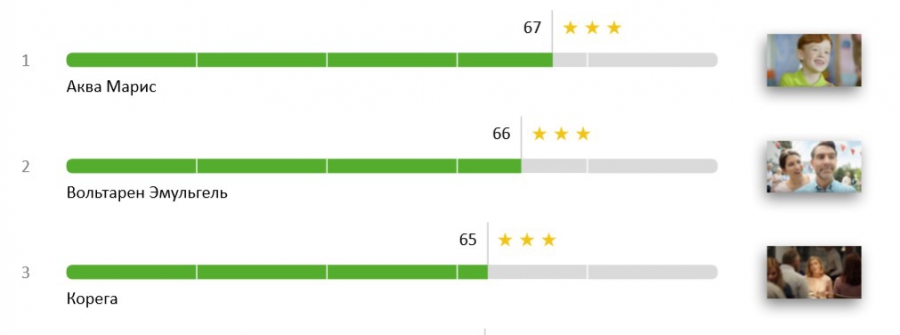 Судя по результатам рейтинга вызвать сильную эмоциональную реакцию у зрителя рекламой лекарственного препарата не так уж просто: ни одному из 10 роликов не удалось попасть в топ по данному критерию и получить максимальную оценку. Но четыре из них все же выбились вперед и ближе всех подобрались к заветной отметке, заработав 3 звезды: «Алмагель А» и крем «Корега» набрали по 65 баллов, «Вольтарен Эмульгель» — 66, и всего одного балла до 4 звезд не хватило рекламе «Аква Марис», она достигла значения в 67 баллов.