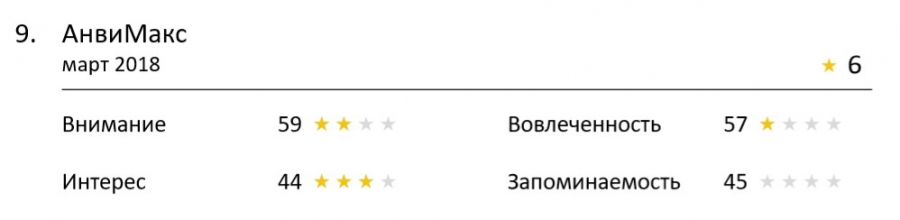 Всего одного балла не хватило рекламе «АнвиМакс», чтобы стать четвертым топовым роликом в четырехзвездочной категории. Он заработал 44 балла и получает заслуженные 3 звезды, что также является отличным результатом.