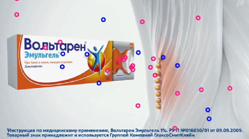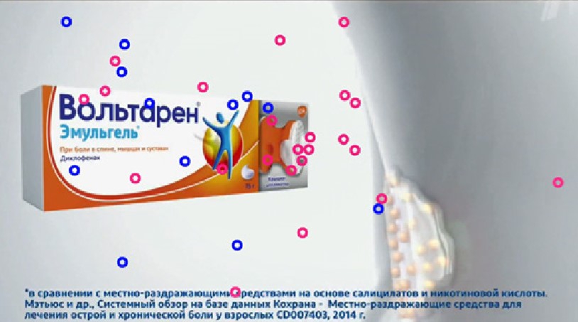 В результате больная спина мужчины видна плохо, но это и не нужно — вся необходимая информация проговаривается. Зато взгляд значительной части респондентов остается там, где были удивленные глаза женщины. Этот эффект можно было бы усилить, если бы перед показом спины продемонстрировать тюбик с «Вольтареном».