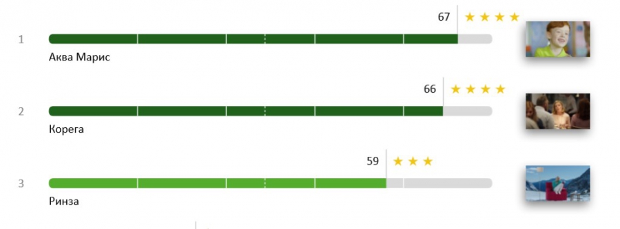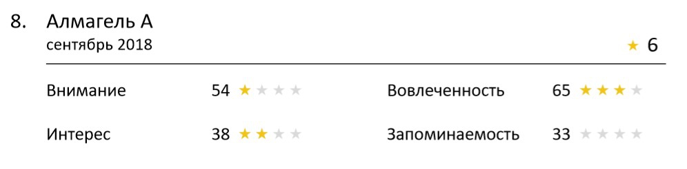 Но не всем роликам удалось справиться с поставленной задачей и получить большую долю внимания респондентов. «Аквамарис» (55 баллов) и «Алмагель А» (54 балла) заняли места в нижней части рейтинга всего с одной звездой, а ролик препаратов «Детралекс» и «Детрагель» набрал всего 50 баллов и не получил ни одной звезды.