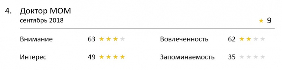 В рейтинге фармы порадовать зрителей интересным сюжетом удалось всего 3 роликам, и они заслуженно получили почетные 4 звезды. Этими роликами стали: «Вольтарен Эмульгель», который продолжает удерживать лидирующую позицию (45 баллов), «Доктор МОМ», который все же смог добраться до топа рейтинга после 3 звезд на показателе «Внимание» (49 баллов), и «Кагоцел», который пока остается безусловным лидером по двум категориям (53 балла).
