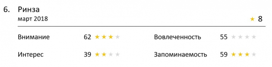 А вот совсем не досталось звезд рекламе препаратов «Ринза» и «Кагоцел». И несмотря на то, что «Ринза» занимала средние позиции по предыдущим показателям, а «Кагоцел» был безусловным лидером по «Вниманию» и «Интересу», им не удалось вызвать эмоций у зрителей.