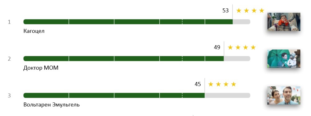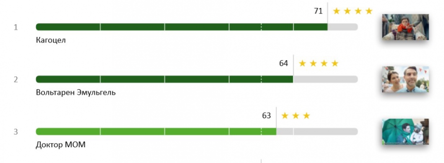 По результатам исследования, «Кагоцел» смог набрать 71 балл и вырваться на первое место этого рейтинга, а вслед за ним с отставанием в 7 баллов расположился ролик «Вольтарен Эмульгель».